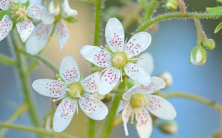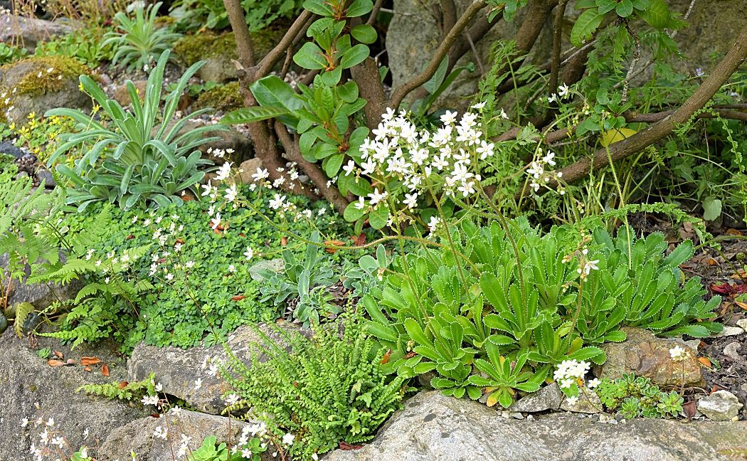 Die Hybride aus Saxifraga paniculata und S. spathularis ist ein ebenso schöner wie pflegeleichter Steinbrech. In meinem Garten gedeiht er gut an schattigen bis halbschattigen Plätzen. Ob im Steingarten ausgepflanzt oder dekorativ im Kübel: Mit seinen markant gezähnten Blättern und den filigranen, rot gepunkteten Blüten ist er ein besonderer Blickfang.