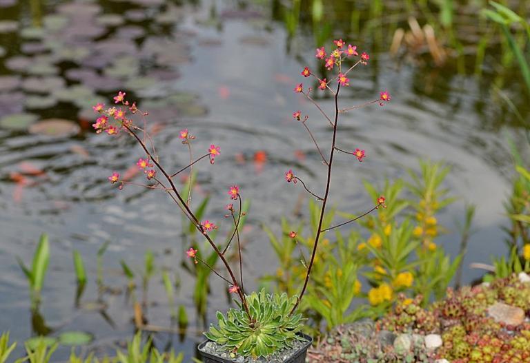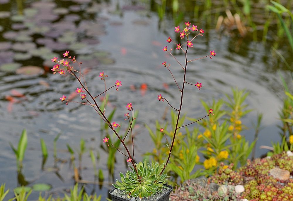 Diese Hybride vereint die Eigenschaften beider Elternarten. In der Wuchskraft und Rosettengröße orientiert sie sich an S. kolenatiana, weist jedoch die charakteristisch schmaleren Blätter von S. longifolia auf. Der Blütenstand ist deutlich kräftiger und höher als bei der Wildart S. kolenatiana. Besonders markant ist die Blütenfarbe: Die leuchtend roten Blüten heben sich deutlich von den meist blasseren Farbtönen der Ausgangsarten ab.