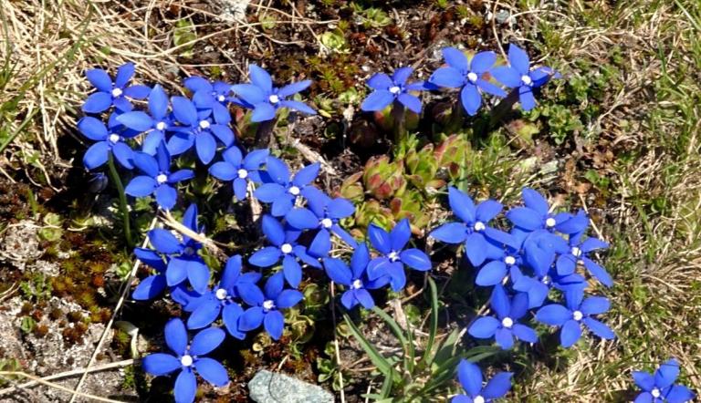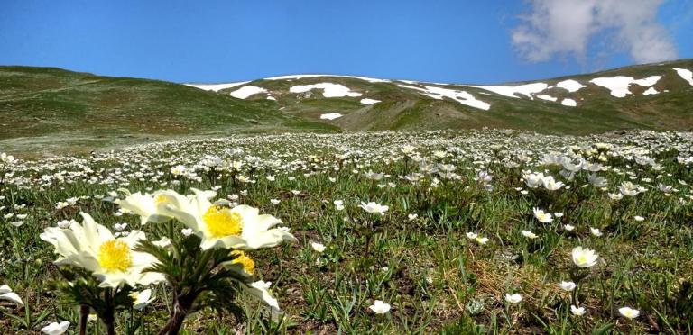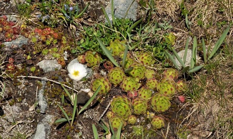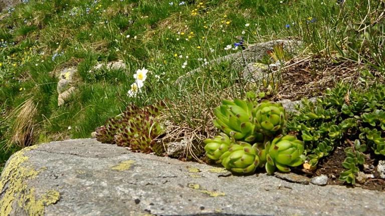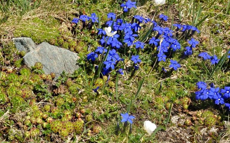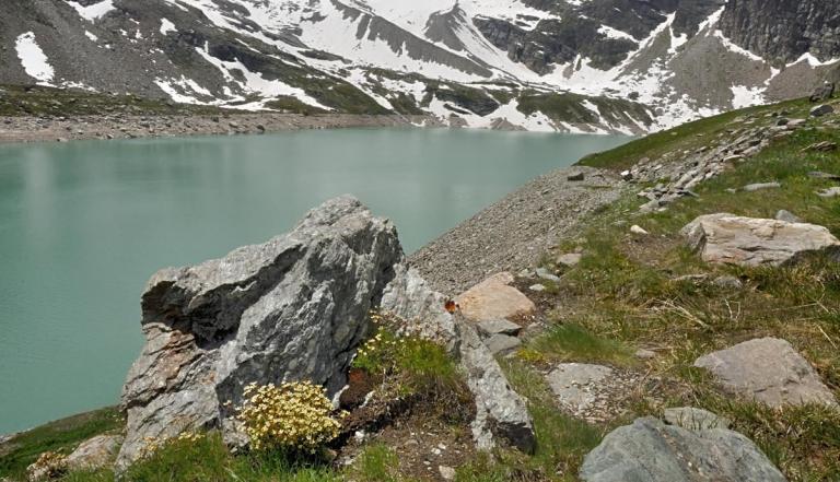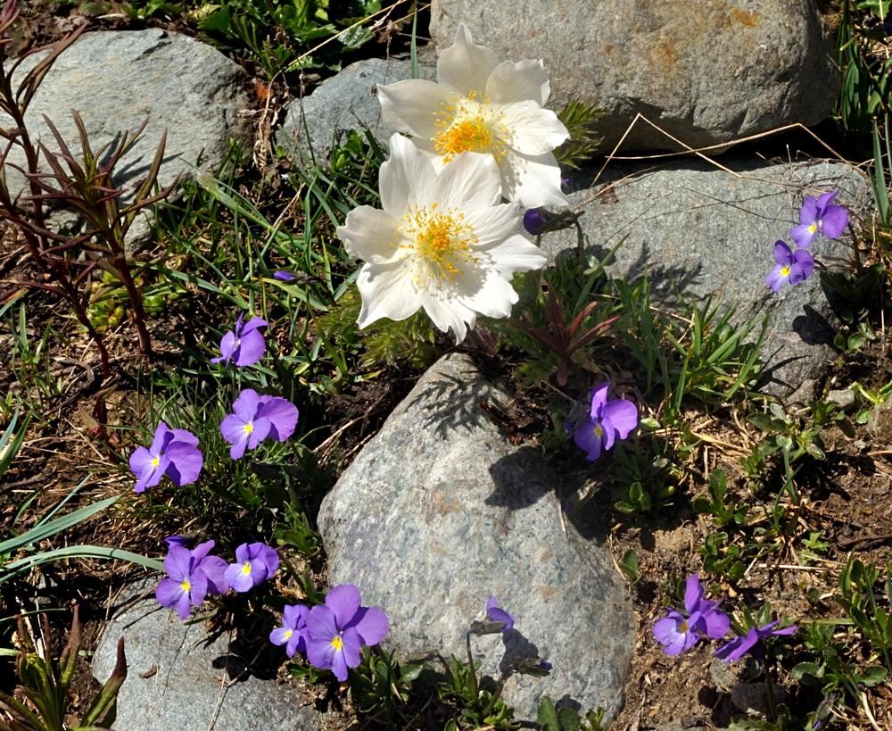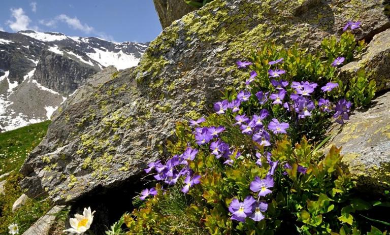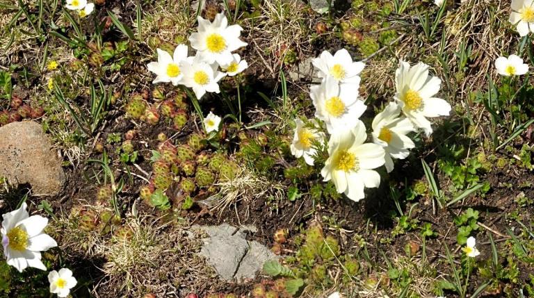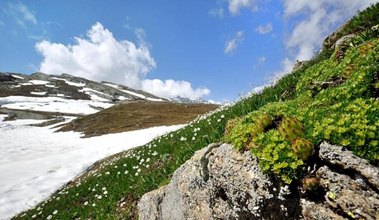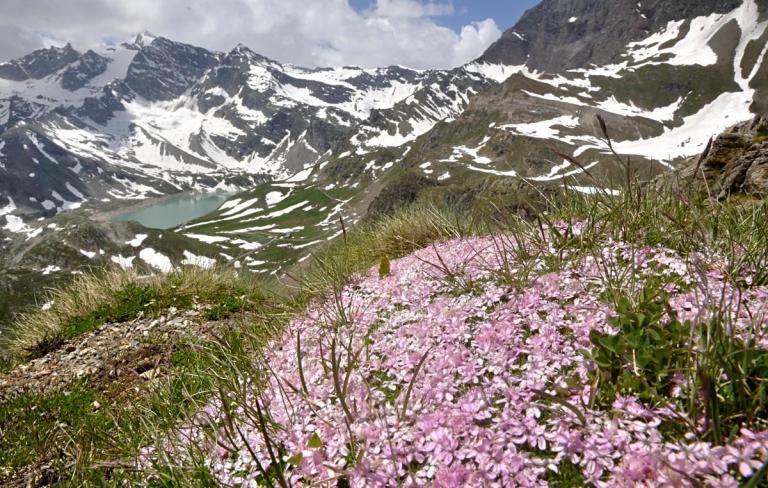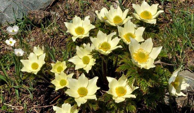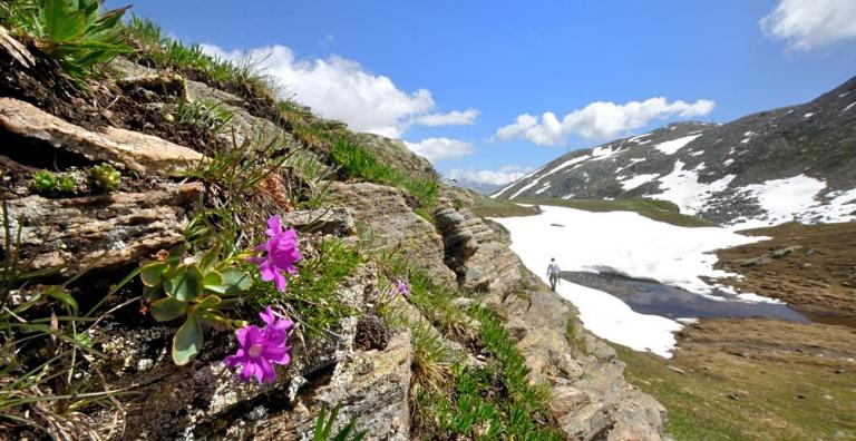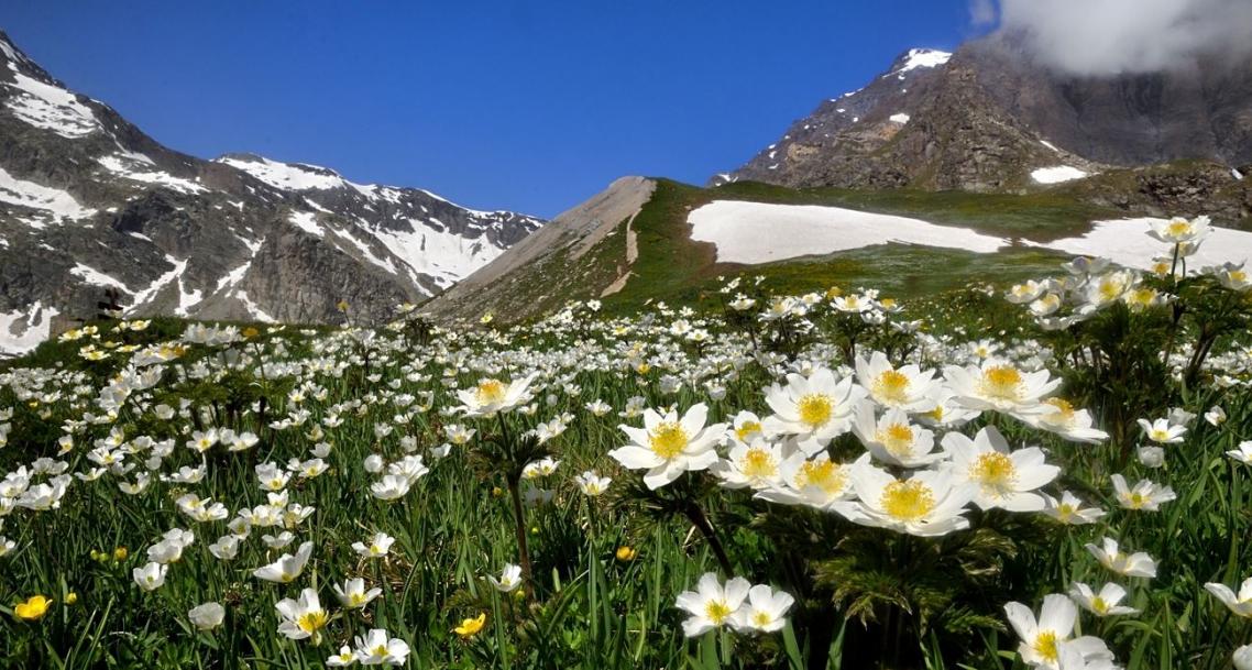 Der Frühling hat den Winter auf der Nivolet-Hochebene verdrängt und die Landschaft erstrahlt in einem wunderschönen Meer aus bunten Blüten. Die Hochebene ist übersät mit unzähligen Alpen-Kuhschellen (Pulsatilla alpina) und Küpfer's Hahnenfüßen (Ranunculus kuepferi), die die gesamte Fläche in leuchtende Farben tauchen.