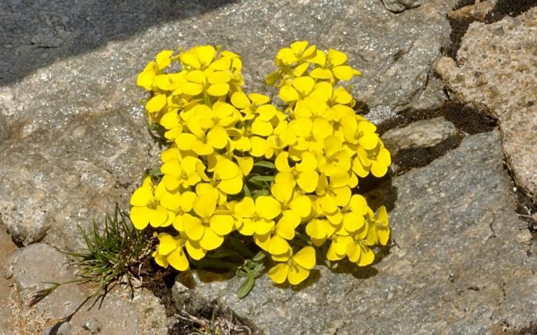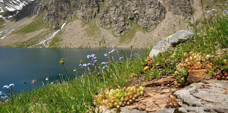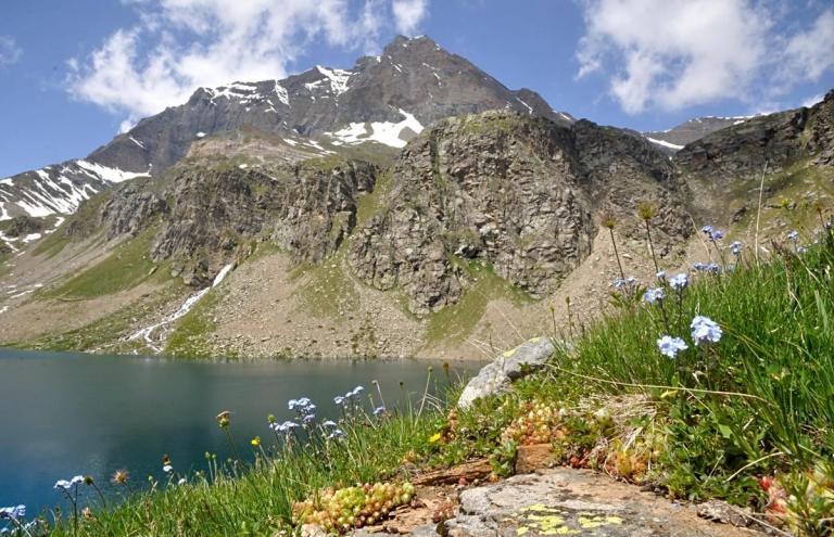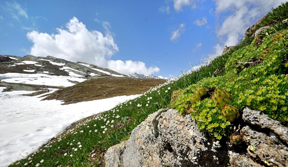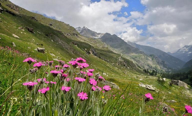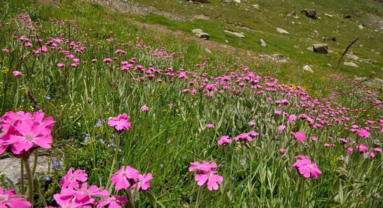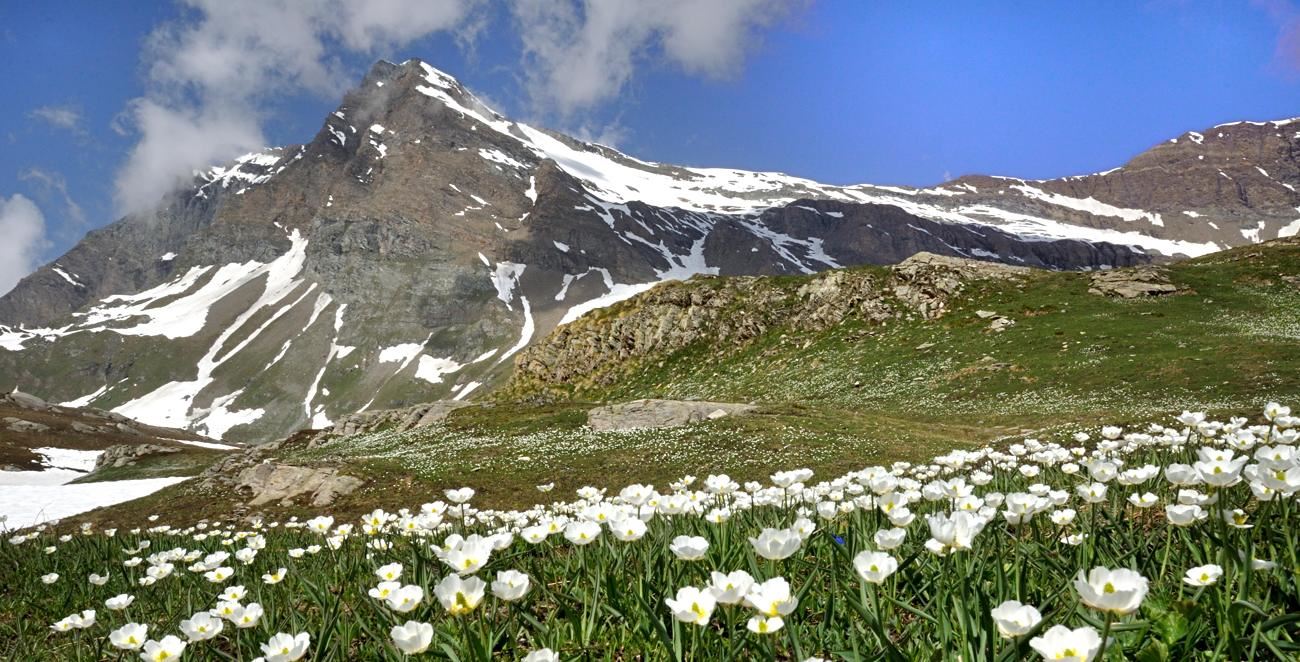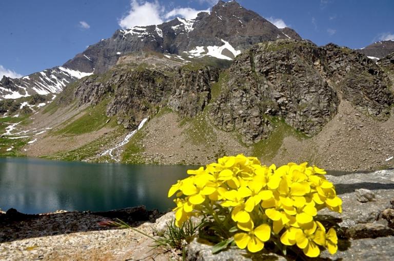 Die Berghänge des Colle del Nivolet sind mit den leuchtenden Blüten des Küpfer's Hahnenfuß (Ranunculus kuepferi) übersät. Imposant erhebt sich im Hintergrund der majestätische Berg La Grivola, der mit 3969 m der zweithöchste Gipfel der Grajischen Alpen ist. Der Nationalpark Gran Paradiso, dessen Name "Großes Paradies" bedeutet, ist in der Tat ein wahrhaftiges Paradies für Pflanzen, Tiere und Naturliebhaber.