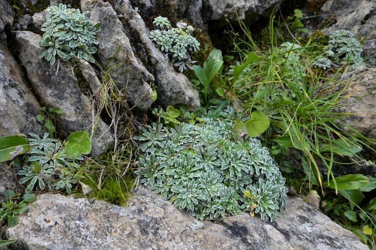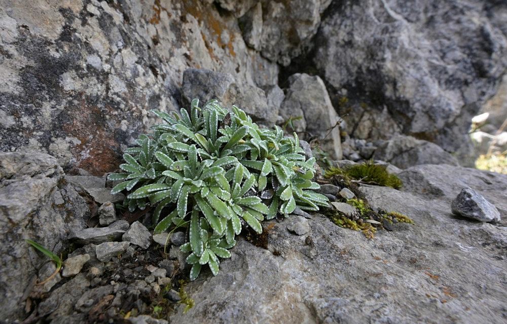 Saxifraga crustata, der Krusten-Steinbrech, dominiert das Felsgestein und verleiht ihm eine besondere Schönheit. Auch in den Schützengräben und Wehranlagen hat S. crustata einen neuen Lebensraum gefunden.