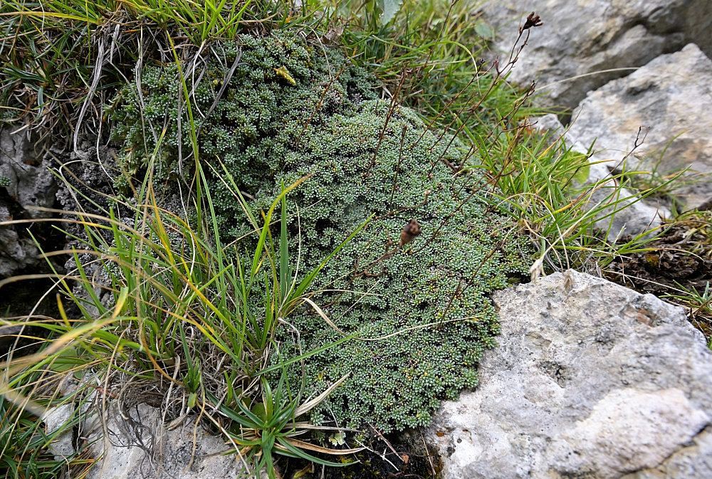 Saxifraga squarrosa, der Sparrige Steinbrech, bildet große, beeindruckende Polster, die das Landschaftsbild bereichern.