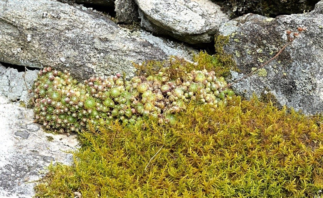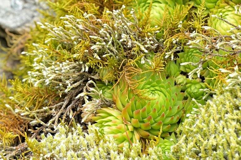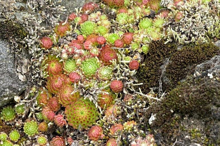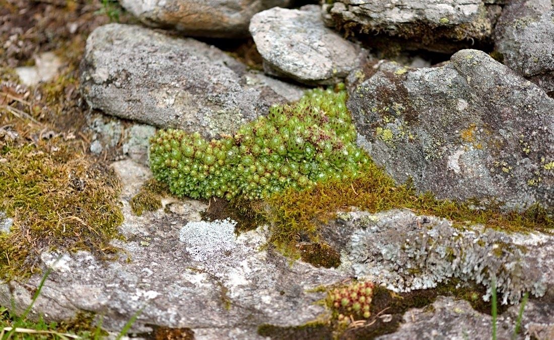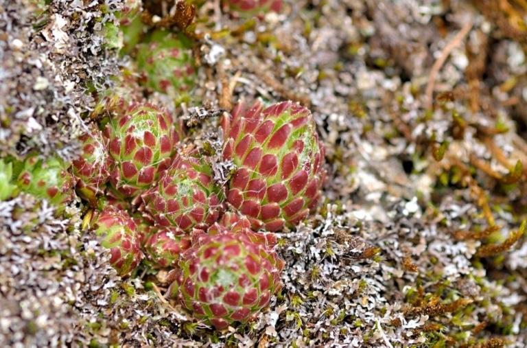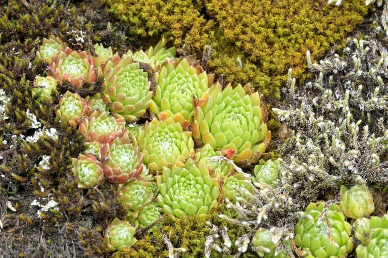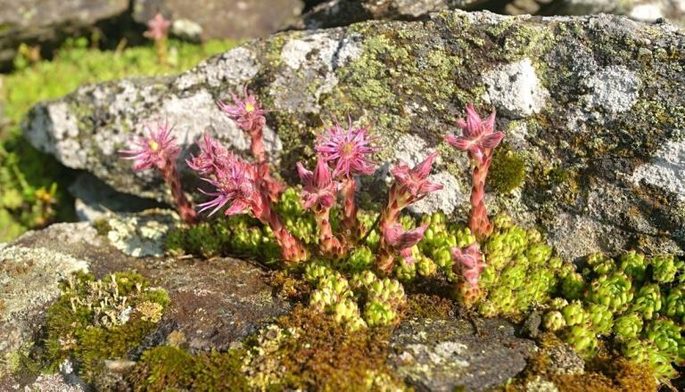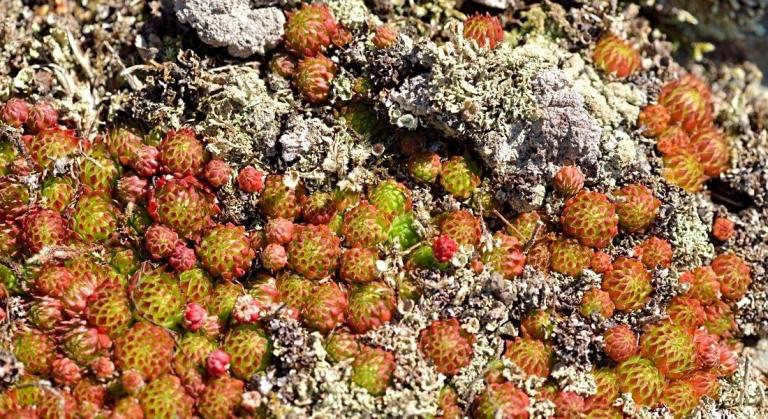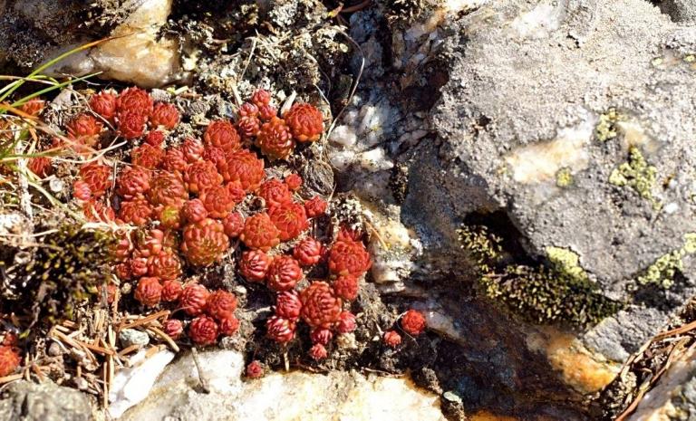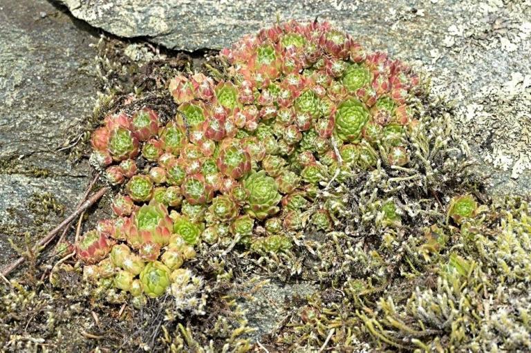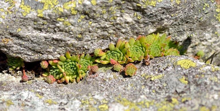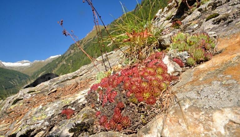 Die Sommer werden immer heißer und trockener, was für Semperviven und Saxifragen an sonnigen Standorten eine große Herausforderung darstellt. Eine bewährte Überlebensstrategie, die man beobachten kann, ist es, sich im Sommer von Gräsern oder kleinen Sträuchern überwuchern zu lassen, um vor der intensiven Sonne geschützt zu sein. Dadurch erhalten die Pflanzen im Frühjahr genügend Licht durch die abgestorbenen Gräser, das sie für die Fotosynthese benötigen. Im Sommer sind die Semperviven oft kaum sichtbar, da sie von den Gräsern verdeckt werden, und ihre Anwesenheit zeigt sich häufig nur noch an den herausragenden Blütenstängeln.