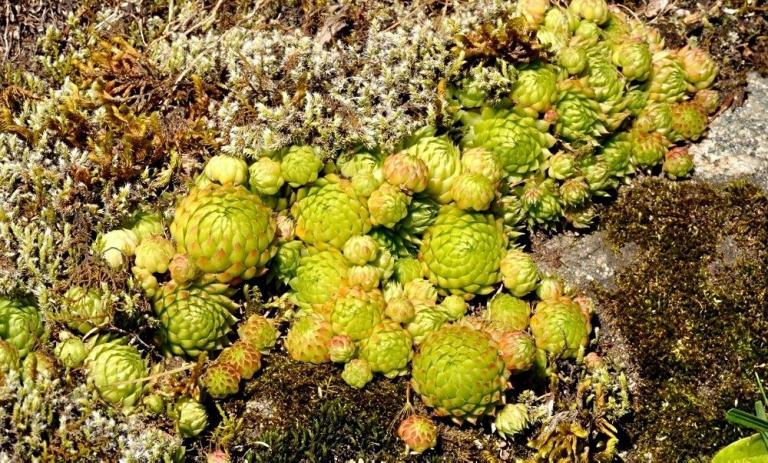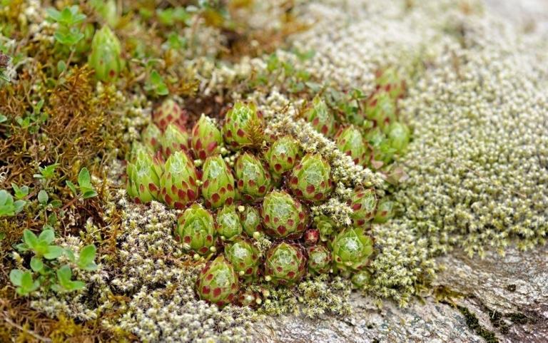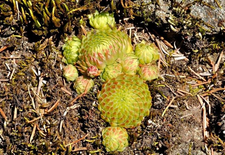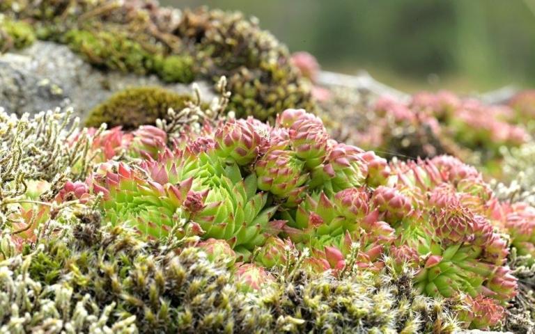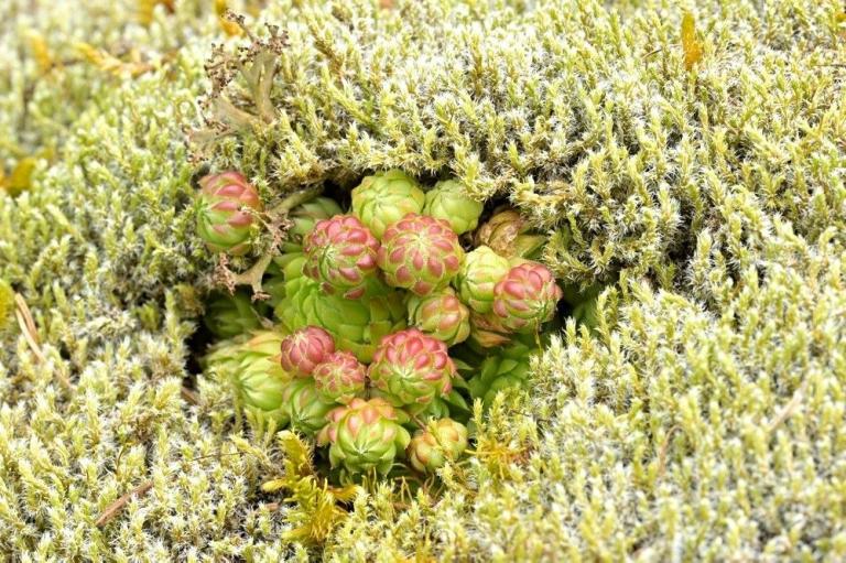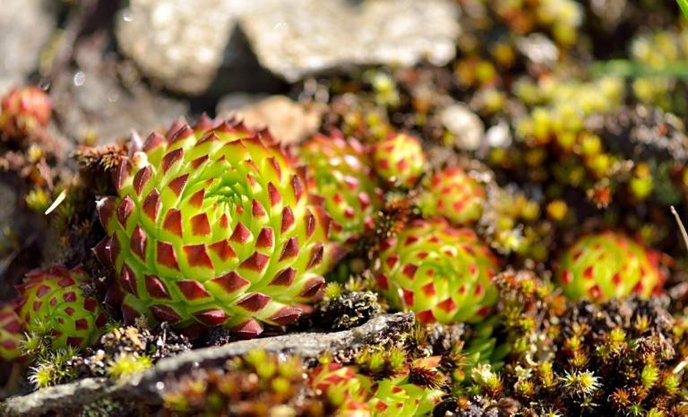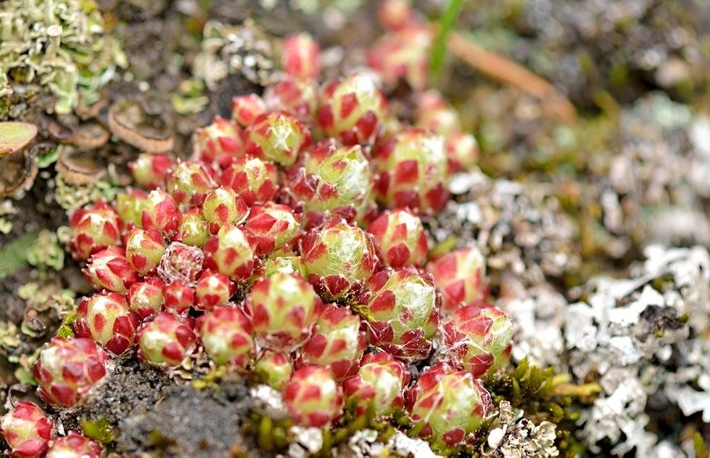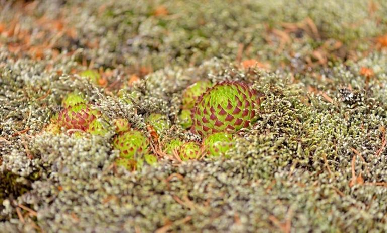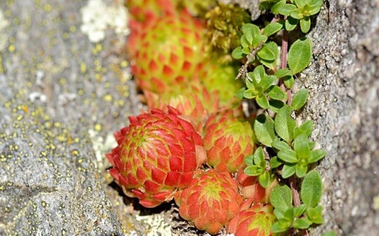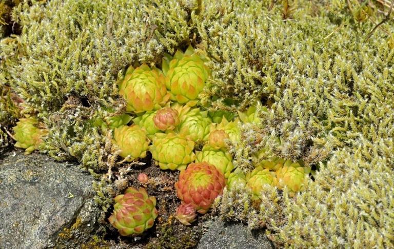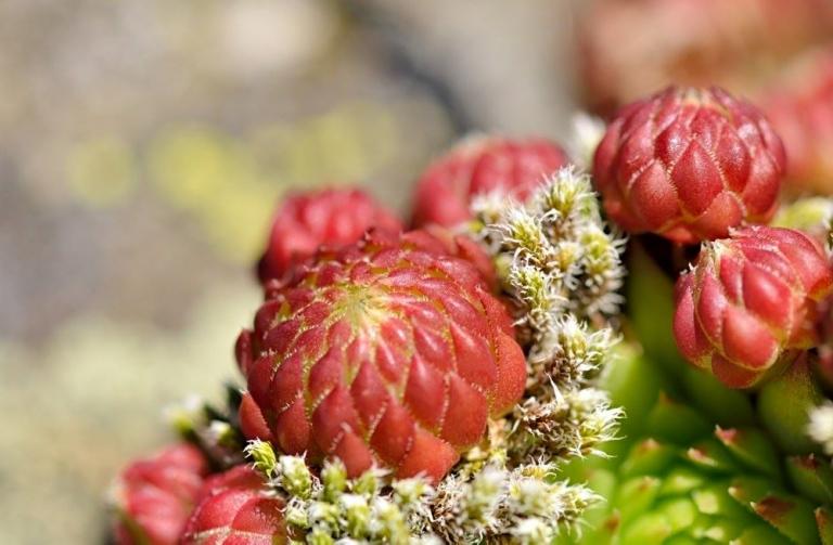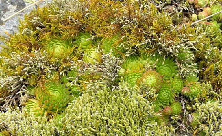 Die Sommer werden immer heißer und trockener, was für Semperviven und Saxifragen an sonnigen Standorten eine große Herausforderung darstellt. Eine bewährte Überlebensstrategie, die man beobachten kann, ist es, sich im Sommer von Gräsern oder kleinen Sträuchern überwuchern zu lassen, um vor der intensiven Sonne geschützt zu sein. Dadurch erhalten die Pflanzen im Frühjahr genügend Licht durch die abgestorbenen Gräser, das sie für die Fotosynthese benötigen. Im Sommer sind die Semperviven oft kaum sichtbar, da sie von den Gräsern verdeckt werden, und ihre Anwesenheit zeigt sich häufig nur noch an den herausragenden Blütenstängeln.