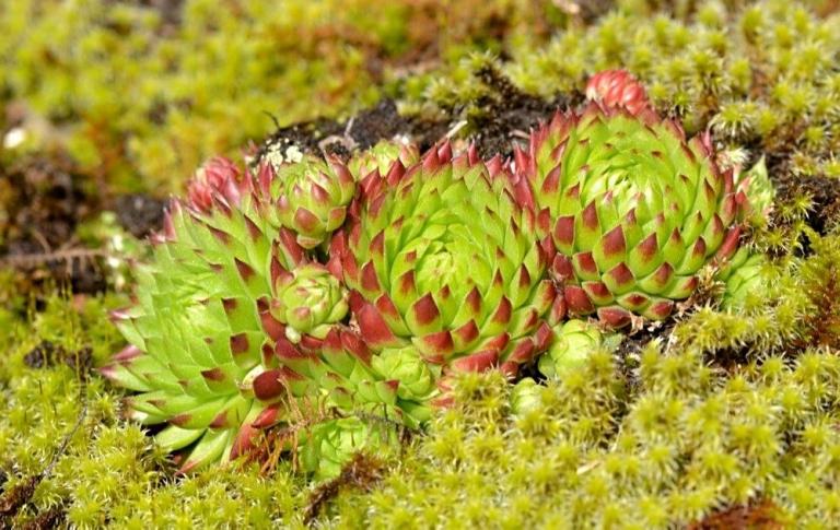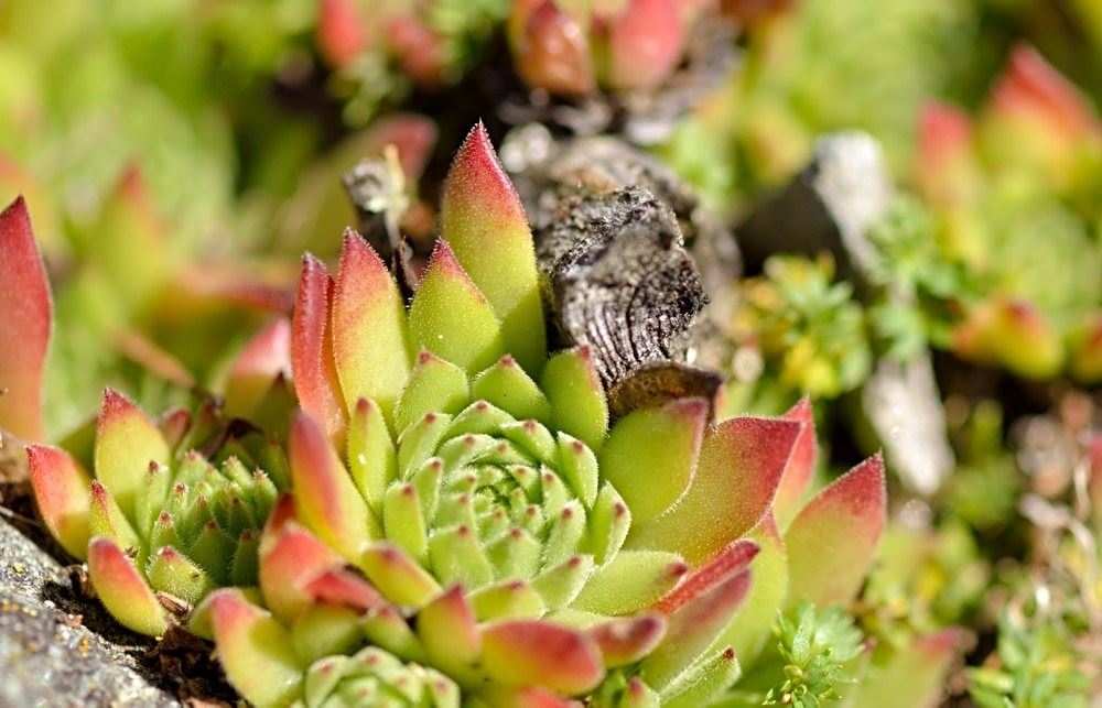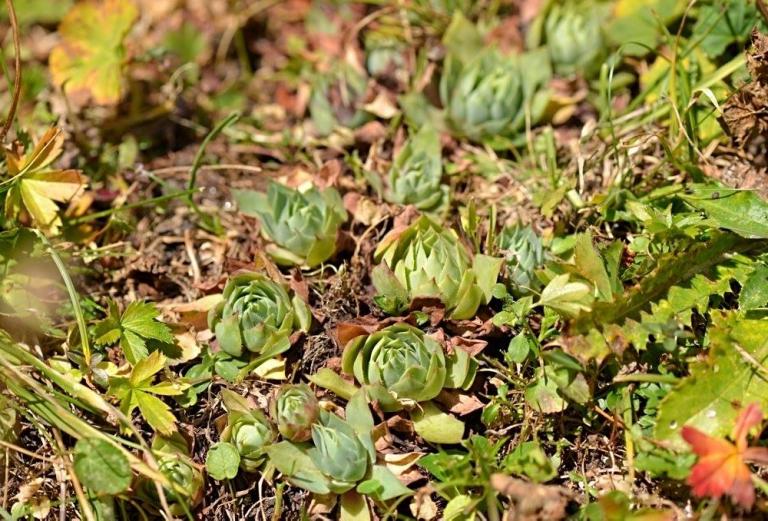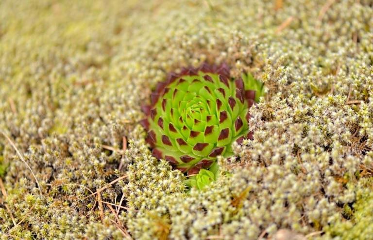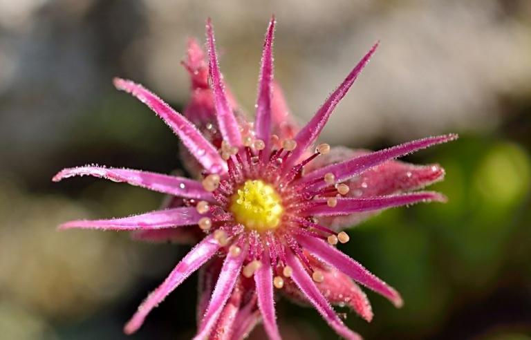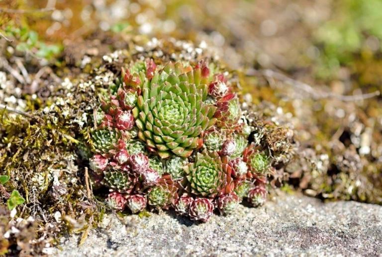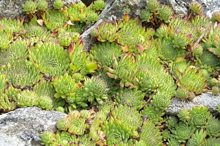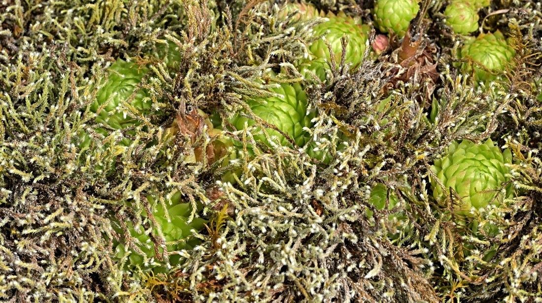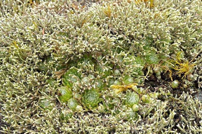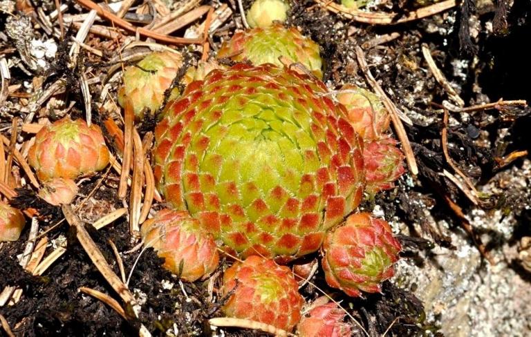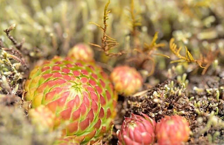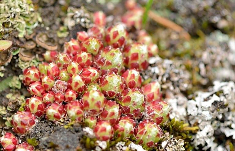 Die Sommer werden immer heißer und trockener, was für Semperviven und Saxifragen an sonnigen Standorten eine große Herausforderung darstellt. Eine bewährte Überlebensstrategie, die man beobachten kann, ist es, sich im Sommer von Gräsern oder kleinen Sträuchern überwuchern zu lassen, um vor der intensiven Sonne geschützt zu sein. Dadurch erhalten die Pflanzen im Frühjahr genügend Licht durch die abgestorbenen Gräser, das sie für die Fotosynthese benötigen. Im Sommer sind die Semperviven oft kaum sichtbar, da sie von den Gräsern verdeckt werden, und ihre Anwesenheit zeigt sich häufig nur noch an den herausragenden Blütenstängeln.