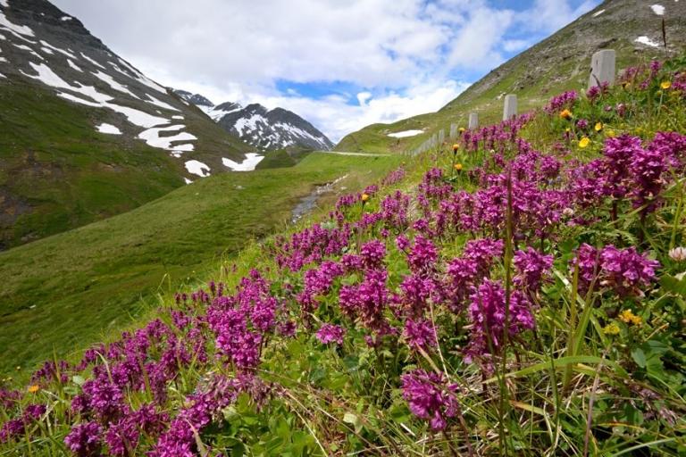 Unser Weg ins Saastal führte uns über den beeindruckenden Furkapass (2429 m), der die Kantone Uri und Wallis verbindet. Während der Fahrt bot sich uns einzigartige Bergpanoramen, darunter auch der majestätische Rhonegletscher. Entlang der Passstraße entdeckten wir eine Vielzahl von alpinen Pflanzen, darunter die wunderschöne Strauß-Glockenblume (Campanula thyrsoides) und das Quirlblättrige Läusekraut (Pedicularis verticillata).