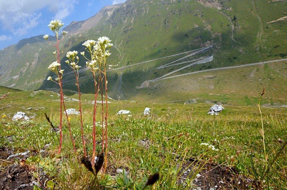 Hier findet man den Saxifraga hostii ssp. rhaetica, auch bekannt als Rätischer Steinbrech, in verschiedenen Variationen. Die Blätter können spitzförmig oder abgerundet sein und weisen unterschiedliche Kalkausscheidungen auf. Die Blütenstengel können grün oder rotbraun gefärbt sein. Die Blüten selbst variieren von dunkelrot gepunkteten Blüten bis hin zu kaum punktierten Blüten. Ein besonderer Rätischer Steinbrech hatte außergewöhnlich kleine Blüten mit einem Durchmesser von 5-7 mm.