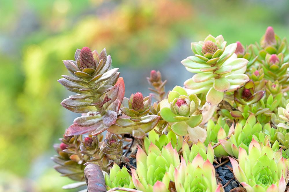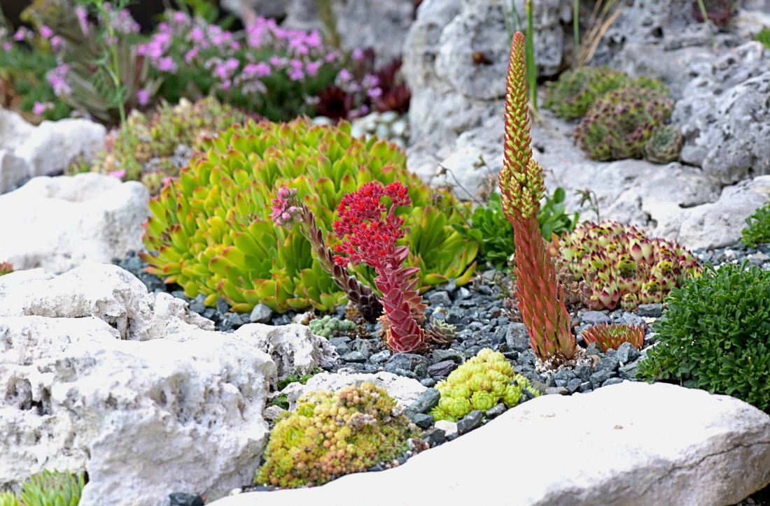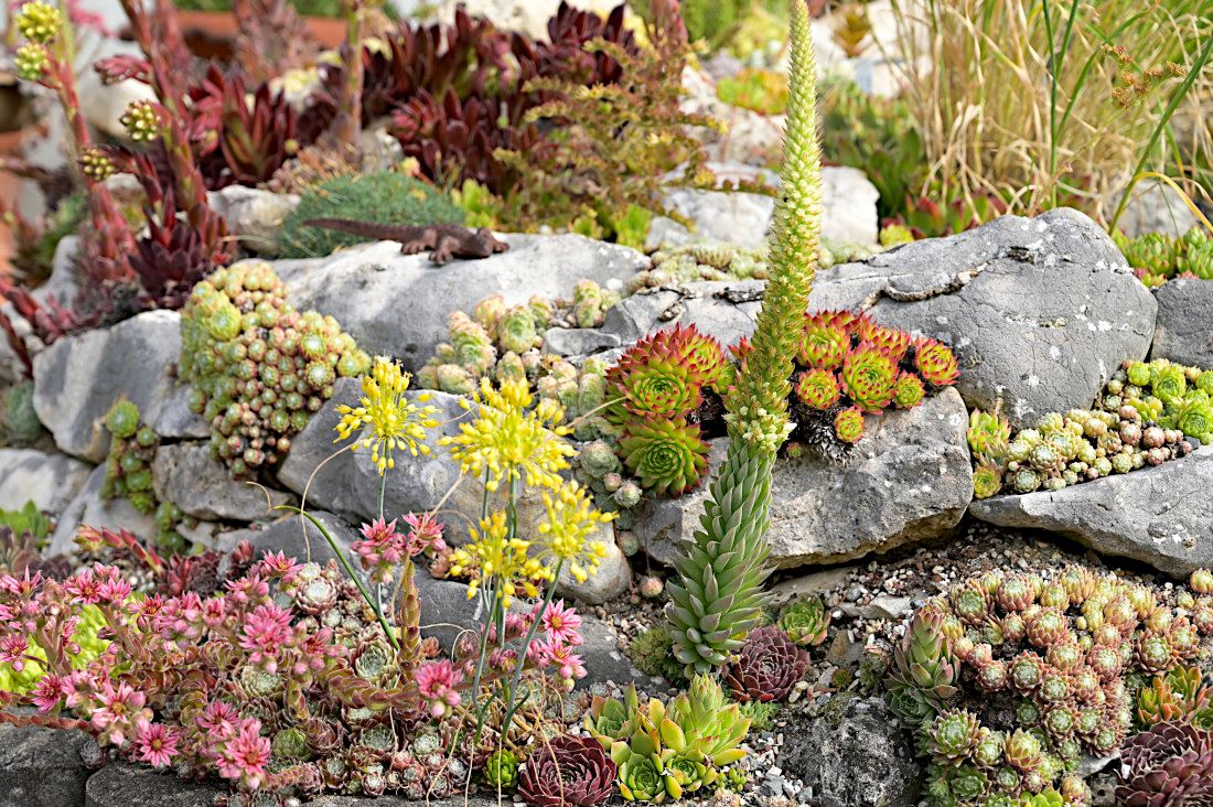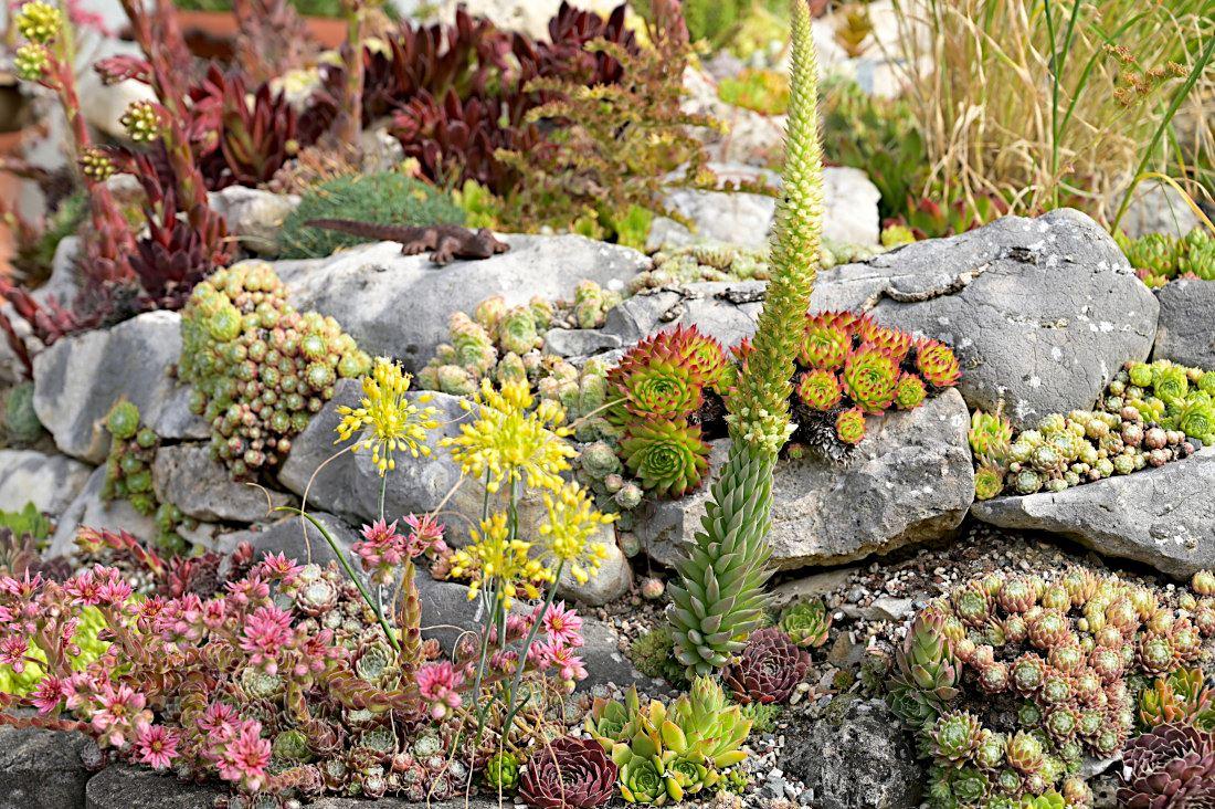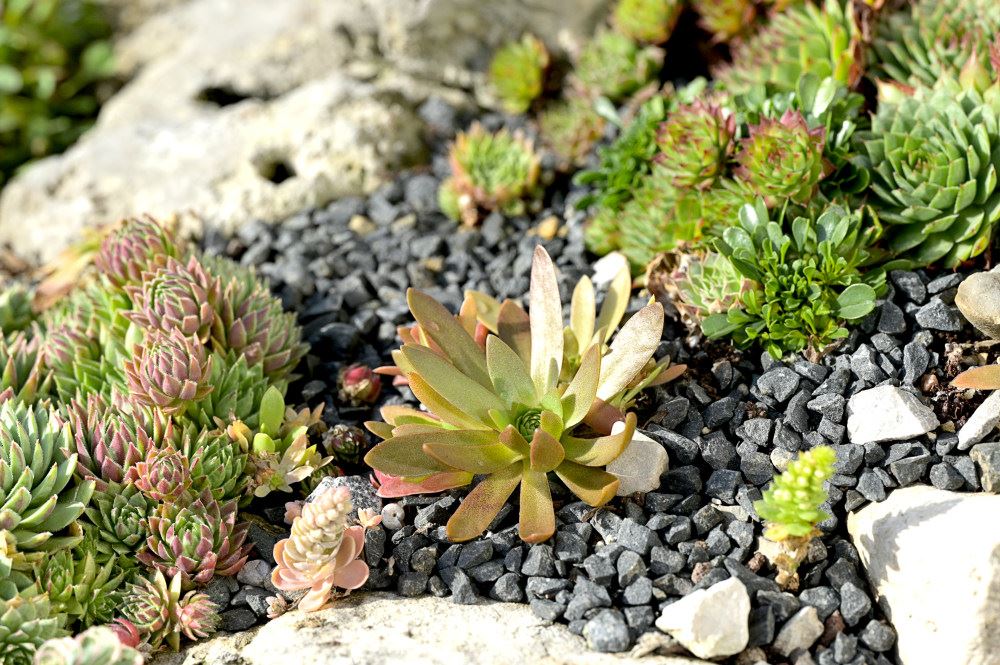 Orostachys spinosa 'Baikalsee' und O. spinosa 'Minor' wachsen im Steinbeet gemeinsam mit Prometheum sempervivoides, Sempervivum heuffelii und S. calcareum.