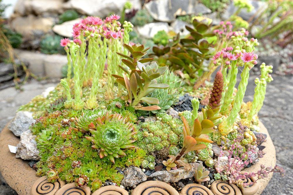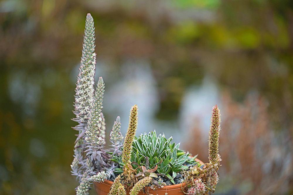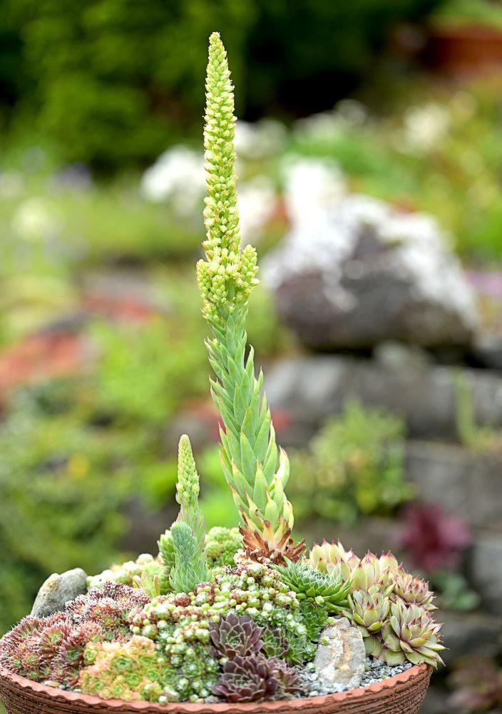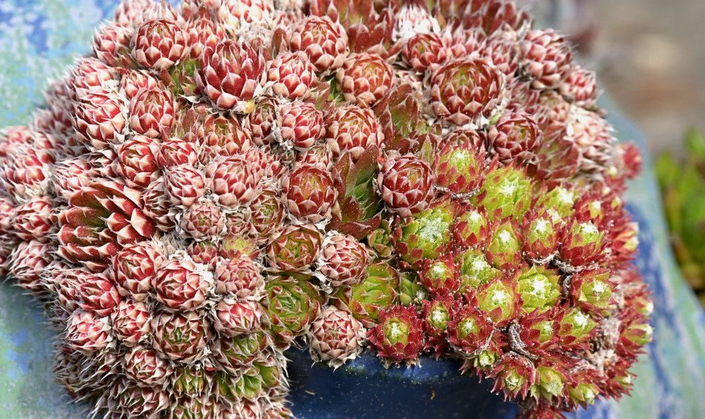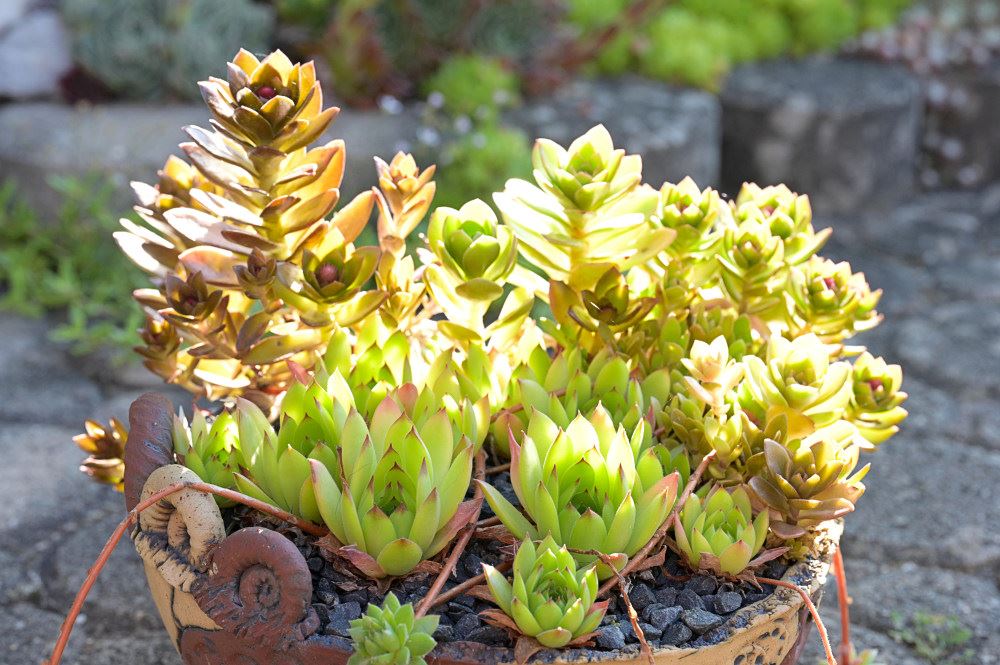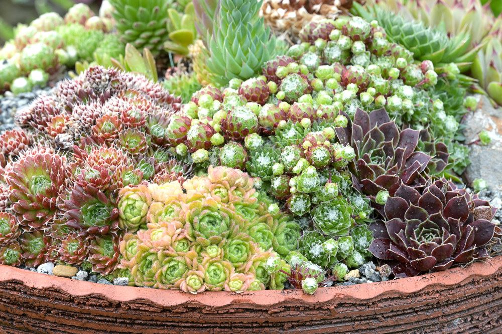 In der Schale entfalten sich die schönen Kreuzungen von Sempervivum pittoni x Sempervivum leucanthum sowie Sempervivum pittoni x Sempervivum arachnoideum. Ergänzt wird dieses farbenfrohe Ensemble durch Orostachys maximowiczii, die Hybride Orostachys maximowiczii x O. malacophylla var. iwarenge und Orostachys japonica.