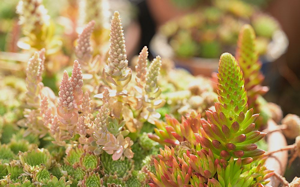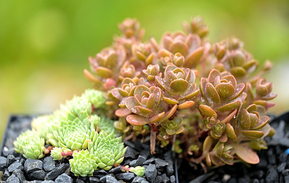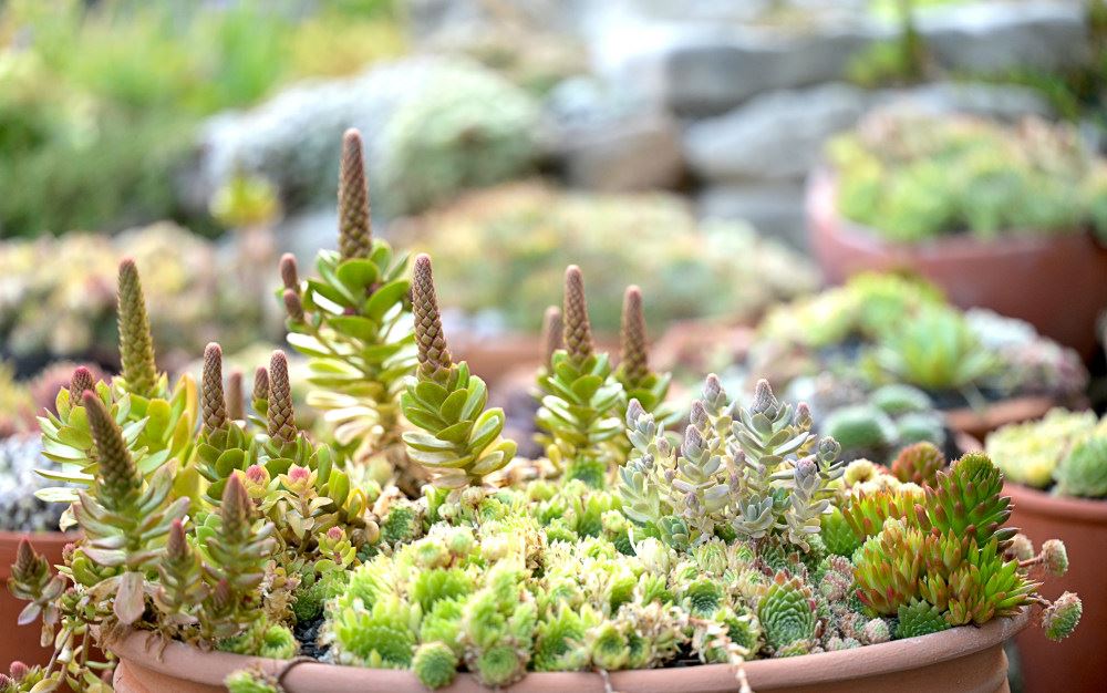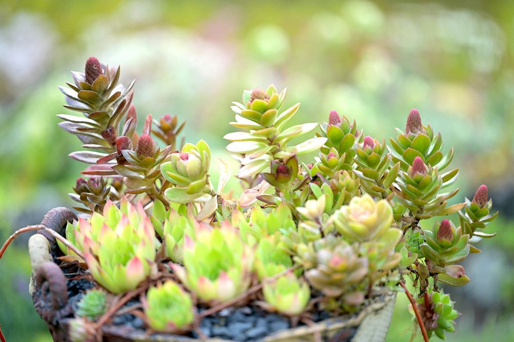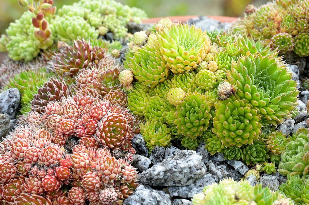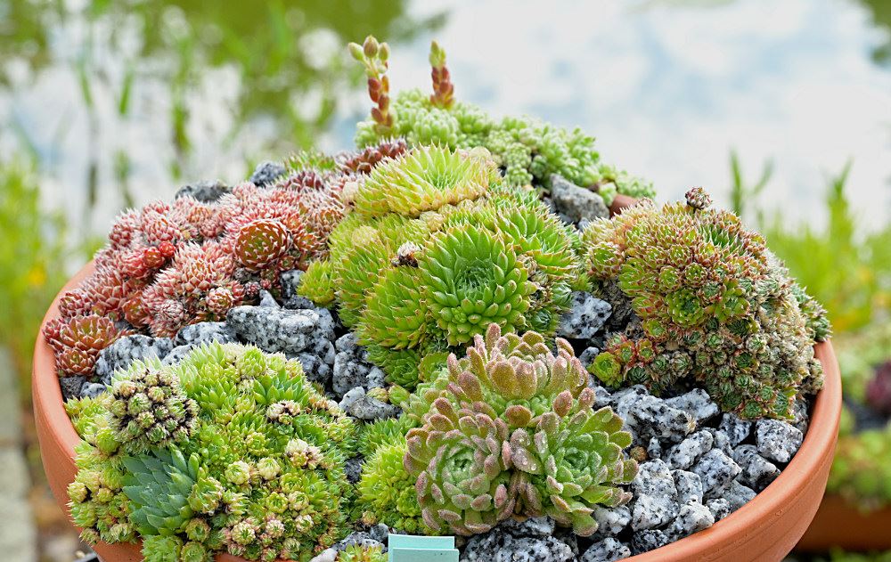 In der Schale entfalten sich die schönen Kreuzungen von Sempervivum pittoni x Sempervivum leucanthum sowie Sempervivum pittoni x Sempervivum arachnoideum. Ergänzt wird dieses farbenfrohe Ensemble durch Orostachys maximowiczii, die Hybride Orostachys maximowiczii x O. malacophylla var. iwarenge und Orostachys japonica.