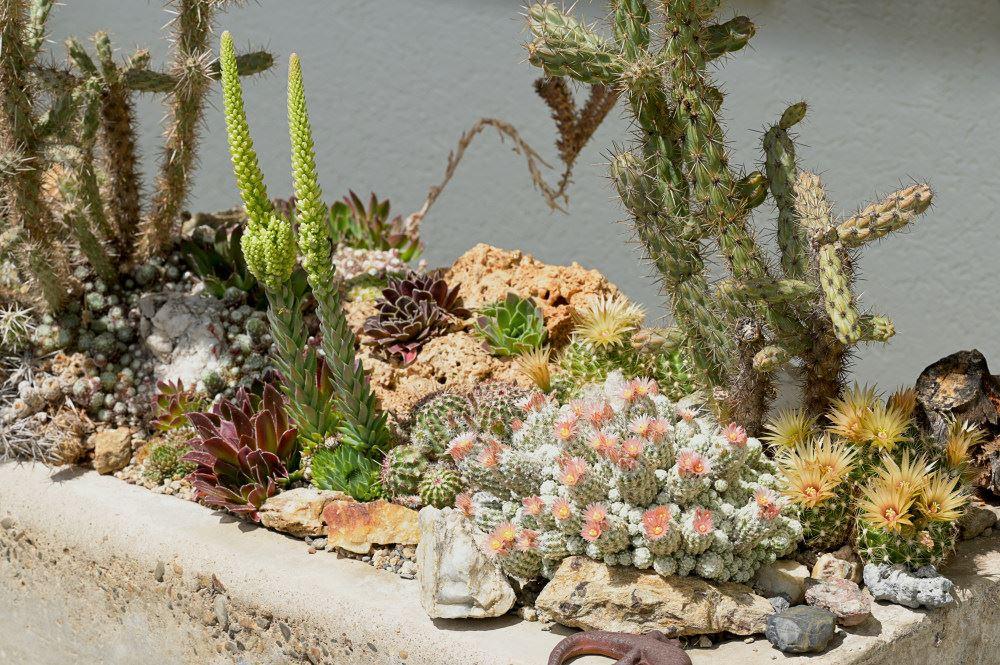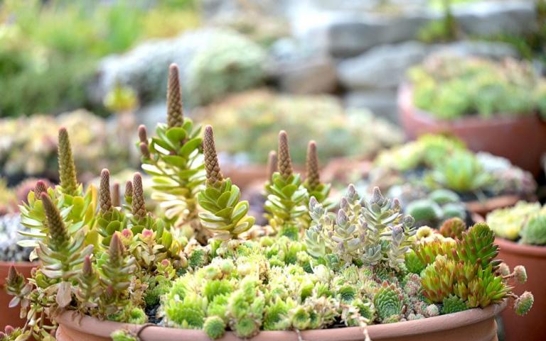 Orostachys thyrsifolia wächst im Trog harmonisch zusammen mit winterharten Kakteen und verschiedenen Sempervivum-Arten.