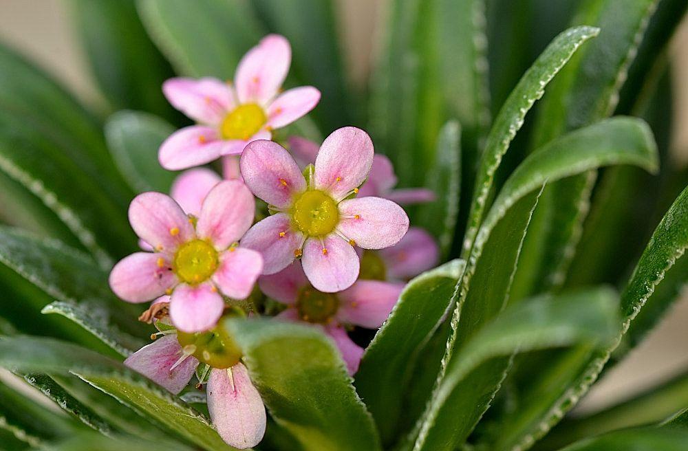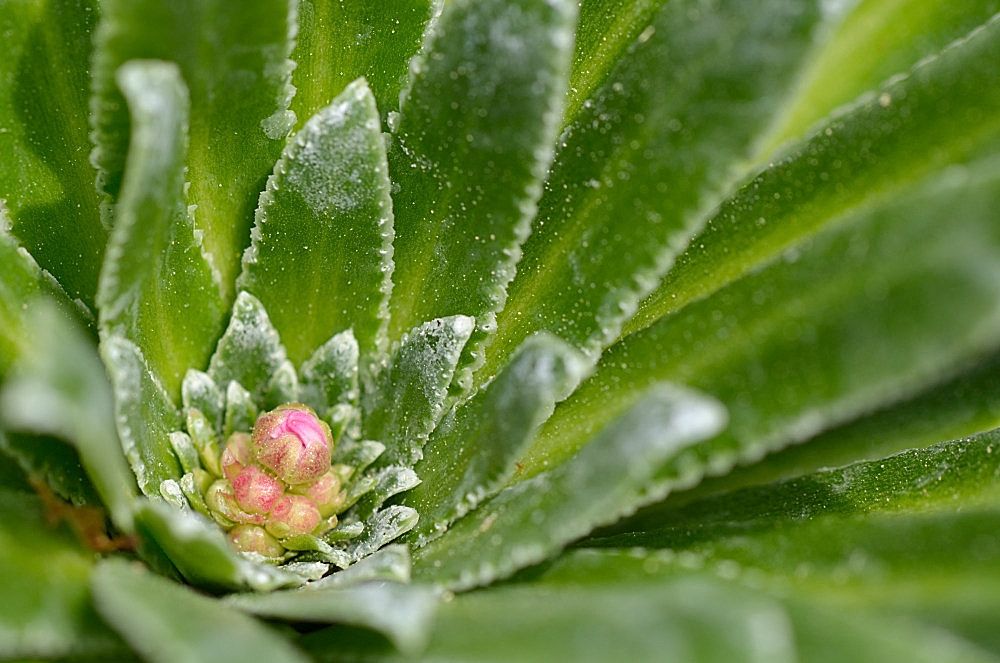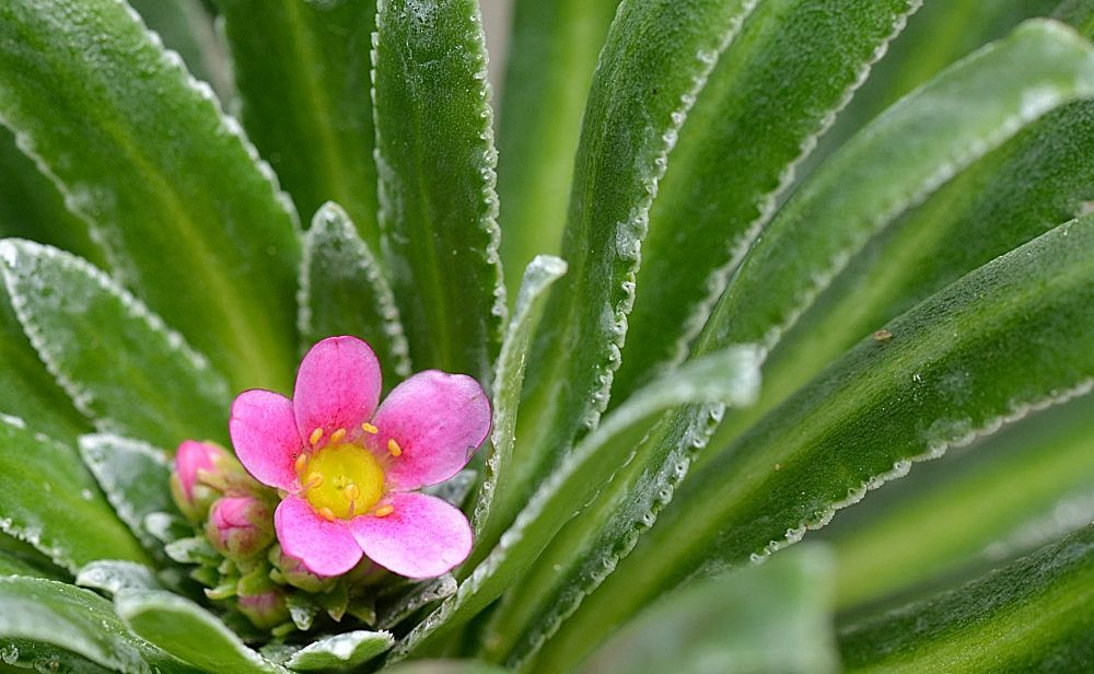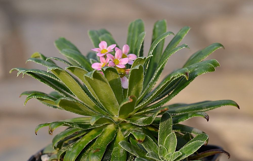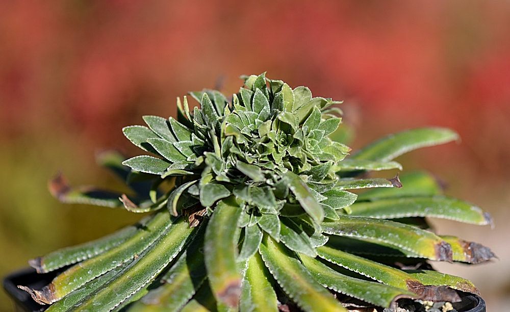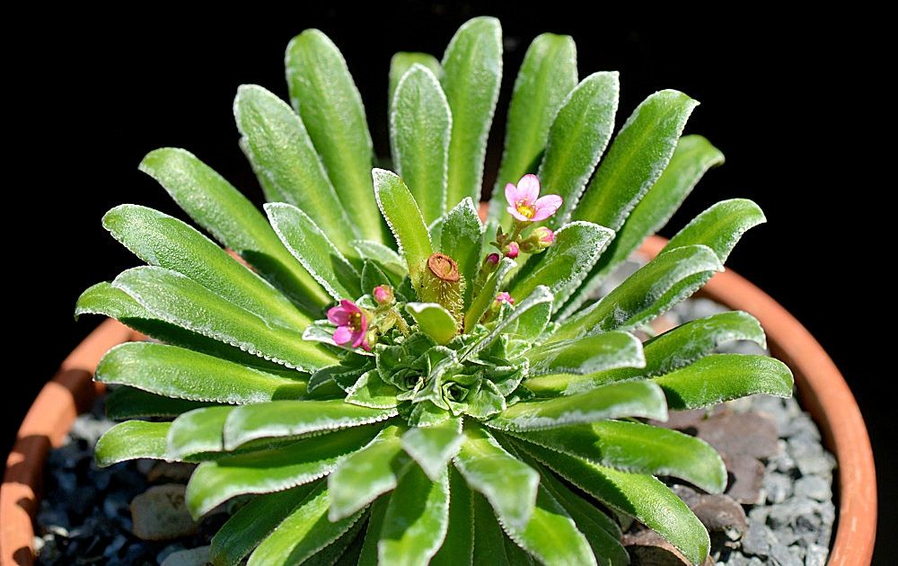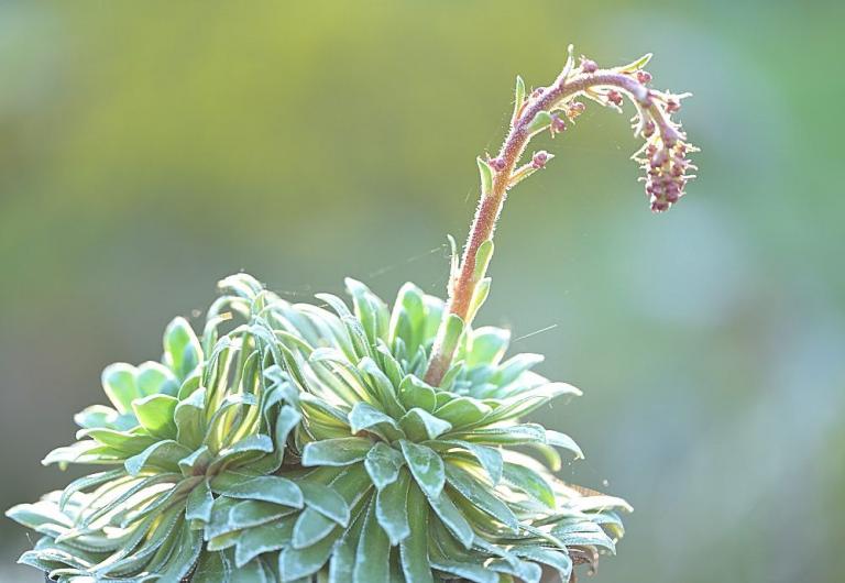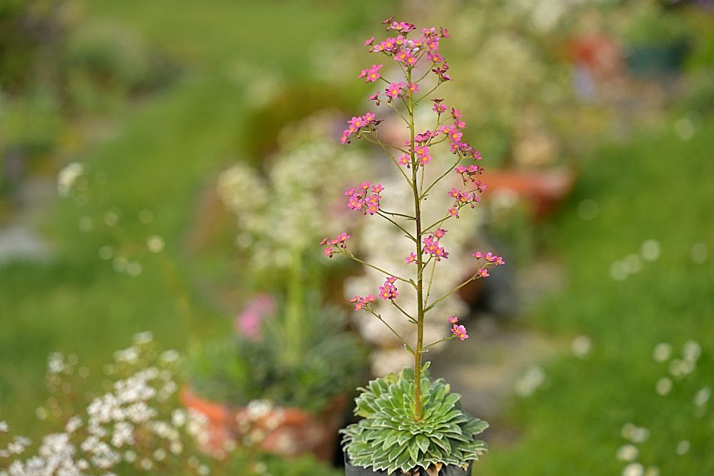 Die grünen, zugespitzten Blätter der Hybride sind ein klares Merkmal von S. kolenatiana. Nach fünf Jahren Standzeit kam es zu einer Wachstumsstörung – möglicherweise ausgelöst durch Wurzelwachstum oder Schädlinge –, woraufhin die Pflanze untypischerweise direkt aus der Rosette mehrere Blüten bildete, ohne zuvor einen zentralen Blütenstand auszutreiben.