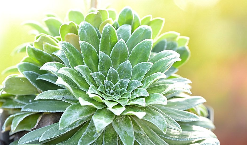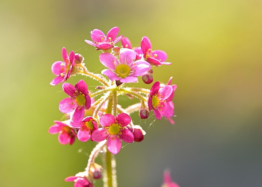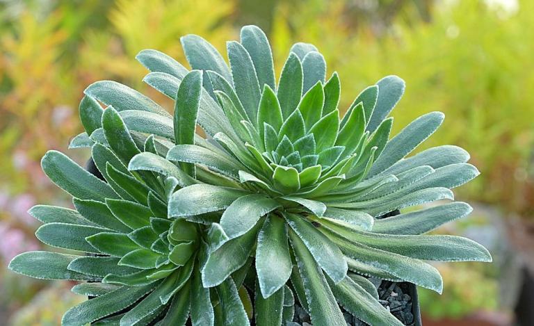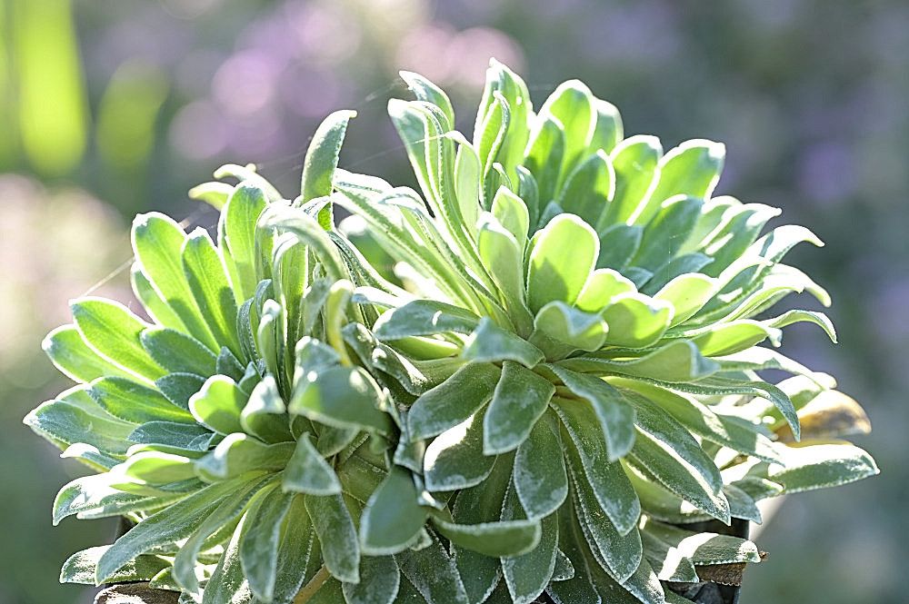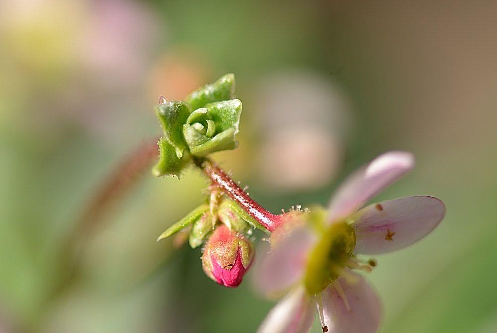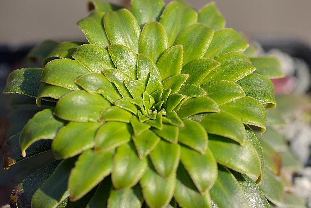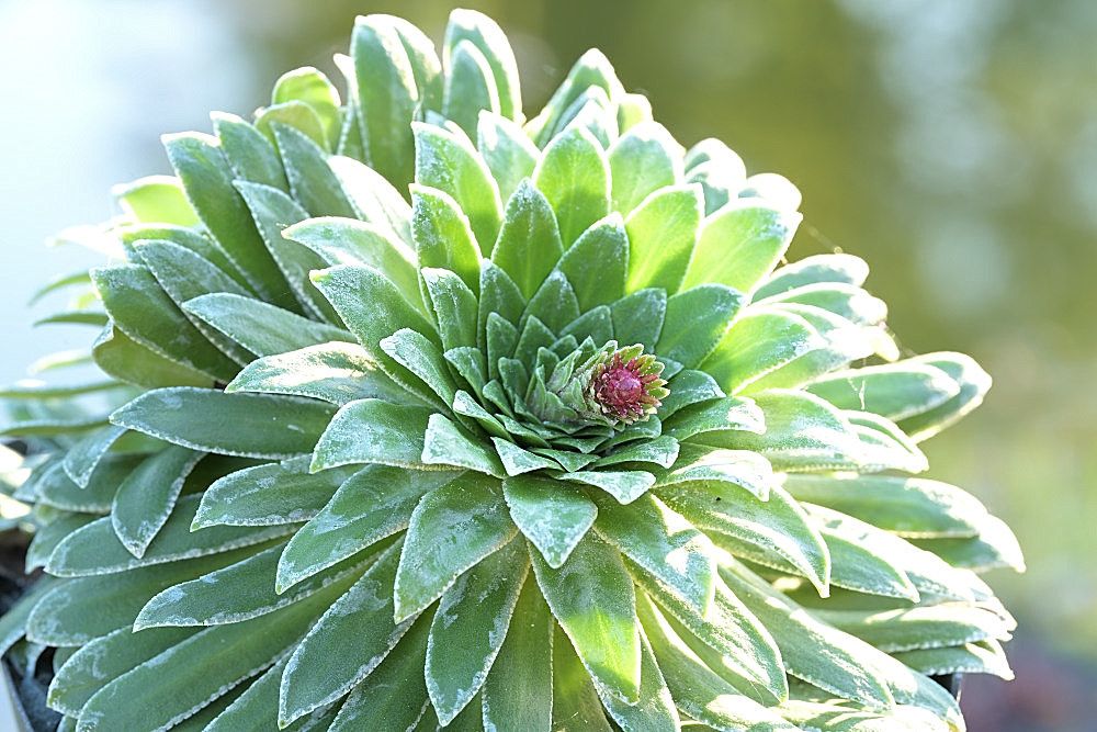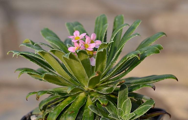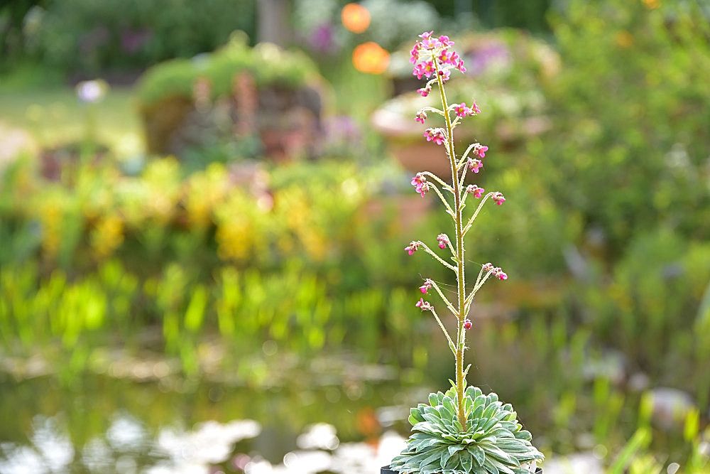Die grünen, zugespitzten Blätter der Hybride sind ein klares Merkmal von S. kolenatiana. Nach fünf Jahren Standzeit kam es zu einer Wachstumsstörung – möglicherweise ausgelöst durch Wurzelwachstum oder Schädlinge –, woraufhin die Pflanze untypischerweise direkt aus der Rosette mehrere Blüten bildete, ohne zuvor einen zentralen Blütenstand auszutreiben.