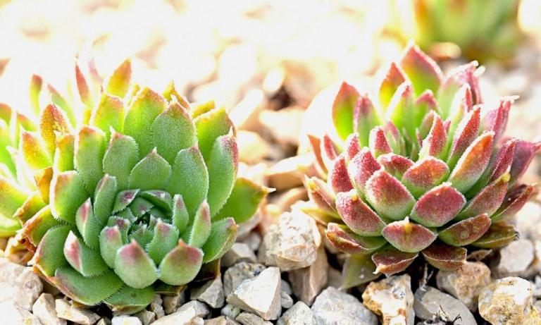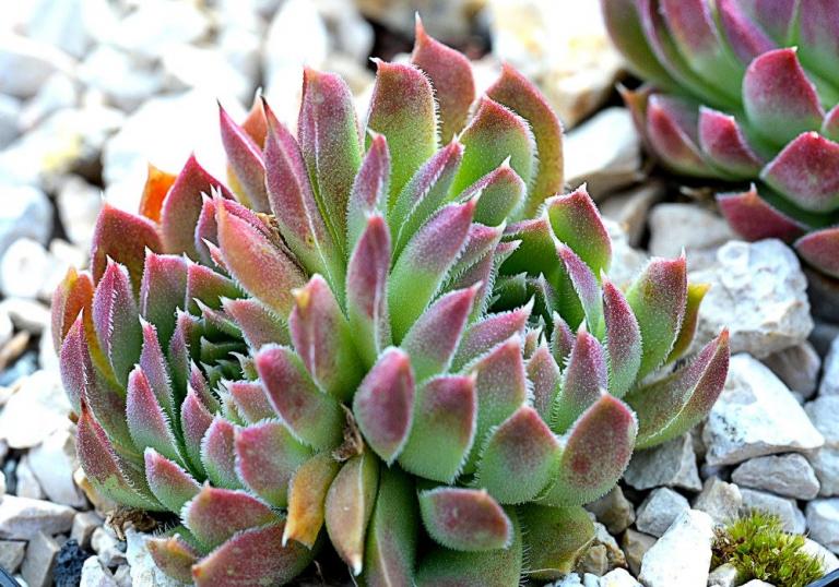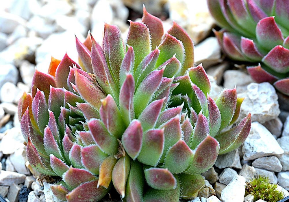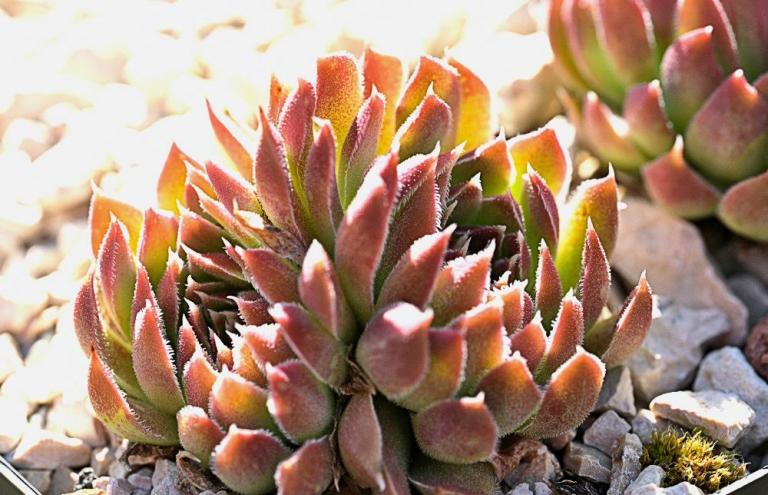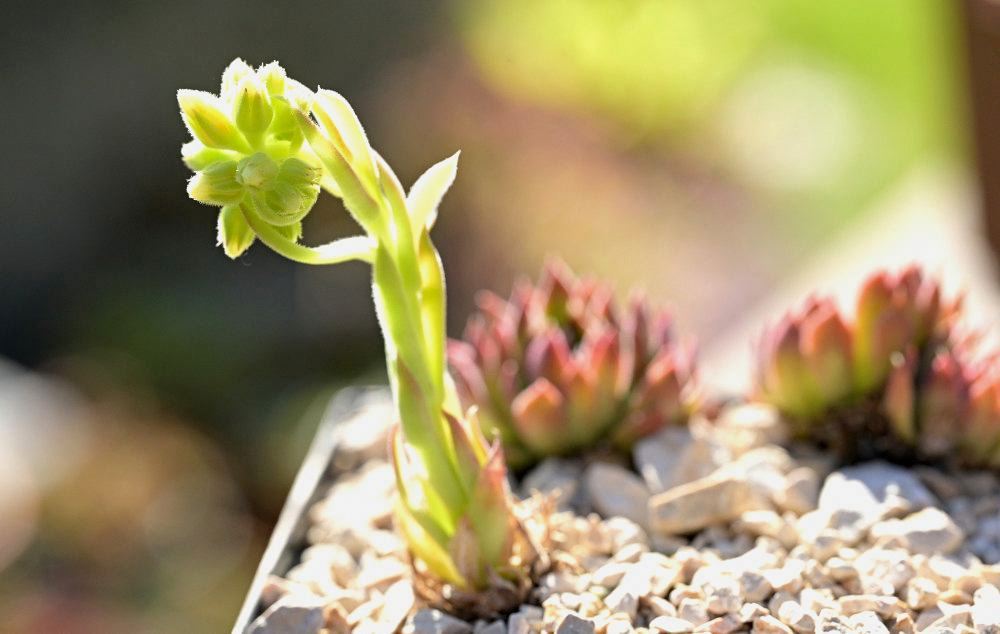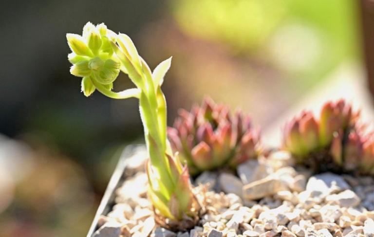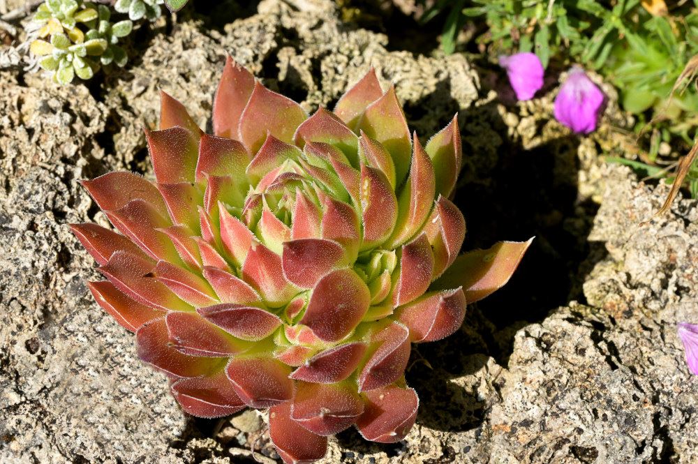 Im Jahr 2022 entstand in meinem Garten eine spannende Kreuzung zwischen Sempervivum globiferum ssp. lagarinianum und S. heuffelii. Solche Hybriden (Sempervivum × nixonii) neigen dazu, besonders reichlich zu blühen. Um das Risiko eines Totalverlusts der wertvollen Pflanze zu verringern, habe ich die Rosette geteilt. Mit einem scharfen, desinfizierten Messer schnitt ich sie in drei Teile, wobei ich sorgfältig darauf achtete, dass an jedem Teilstück ein Stück der Pfahlwurzel erhalten blieb. Nach einer zweitägigen Antrocknungsphase wurden sie wieder eingepflanzt. Eine der Rosetten blühte bereits im selben Jahr, doch erfreulicherweise haben zwei weitere überlebt.