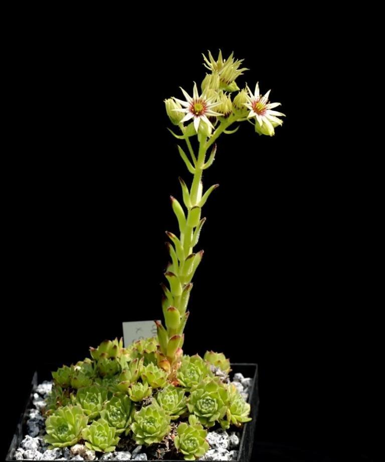 Die Eltern meiner Kreuzung sind S. arachnoideum ssp. tomentosum aus der Schlucht Gorges de Daluis in den Alpes-Maritimes in Frankreich und S. grandiflorum aus Gressoney im Aostatal, im Monte Rosa-Massiv in Italien. Die Hybride, die daraus entstanden ist, hat bemerkenswert fast weiße Blütenblätter mit einem violettpurpurnen Grund.