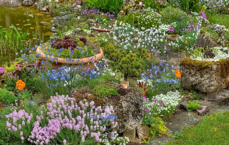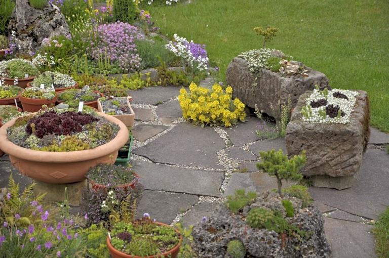 Die Bepflanzung zwischen den Schalen und Trögen verändert sich durch selbst Aussaaten wie Aethionema grandiflorum (Großblütiges Steintäschel), Dianthus campestris und Dianthus deltoides (Heide-Nelke), Echium russicum (Russischer Natternkopf), Erinus alpinus (Alpenbalsam), Linum perenne (Ausdauernder Lein), Linaria aeruginea (kleinwüchsiges Leinkraut), verschiedene Thymus-Arten und Papaver atlanticum (Atlas-Mohn) jährlich.
