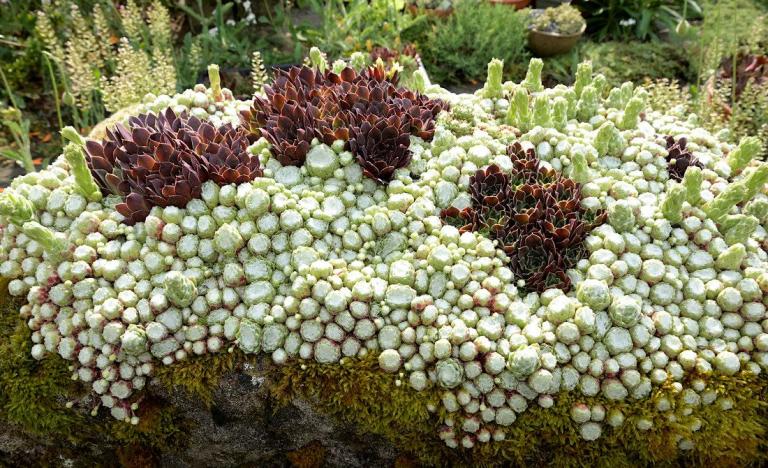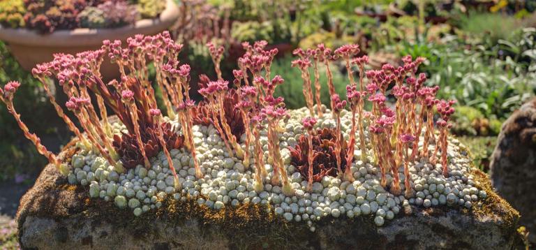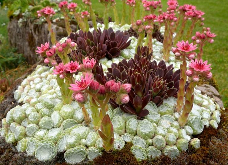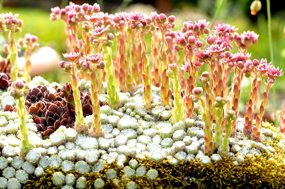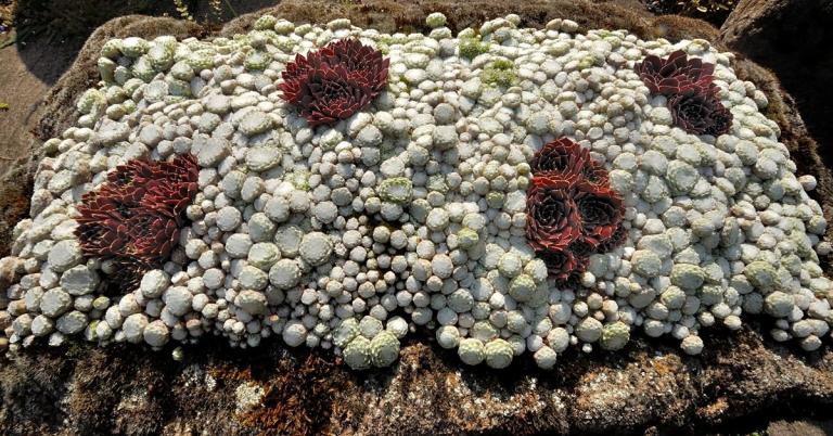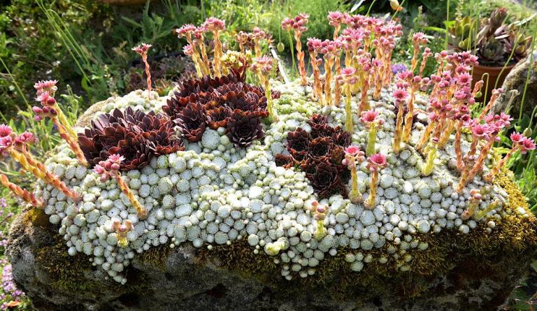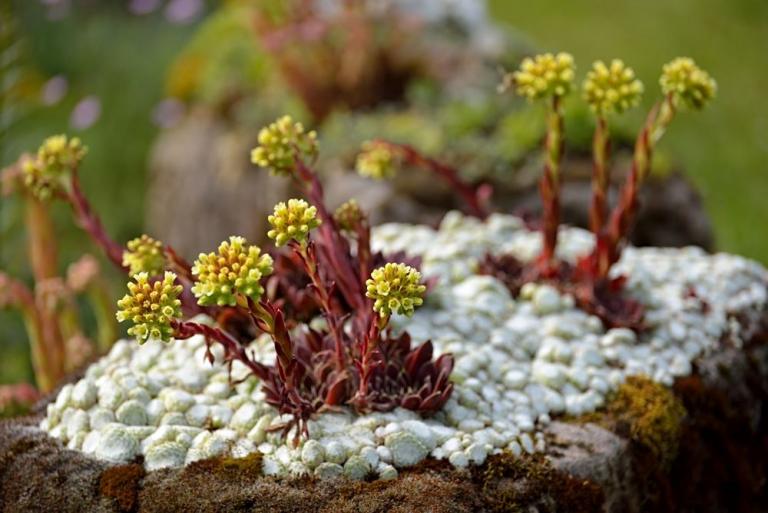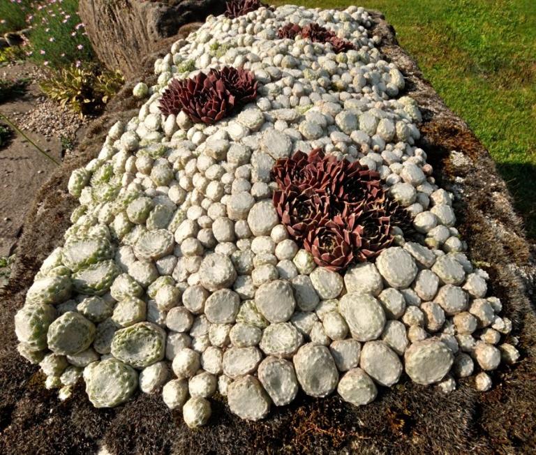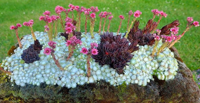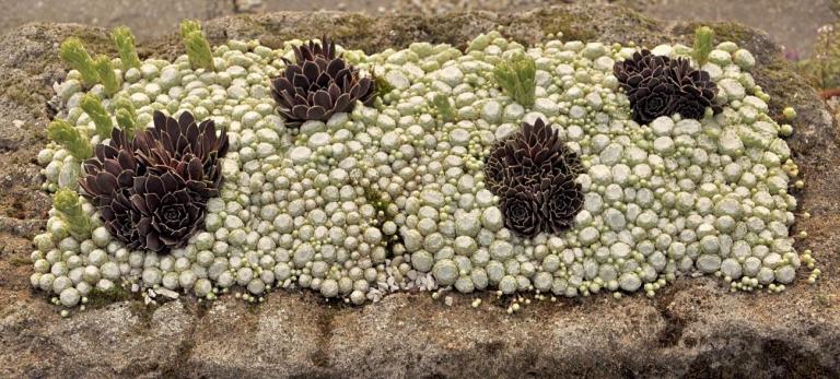 Der Sandstein-Trog ist mit Sempervivum arachnoideum ssp. tomentosum bepflanzt, einer Filzigen Spinnweb-Hauswurz aus der Gorges De Daluis in den Seealpen in Frankreich. Um die zauberhaften Silberspinner noch besser zur Geltung zu bringen, wurden vier dunkelbraun gefärbte Sämlinge (MRO) von Sempervivum heuffelii in den Trog gepflanzt.